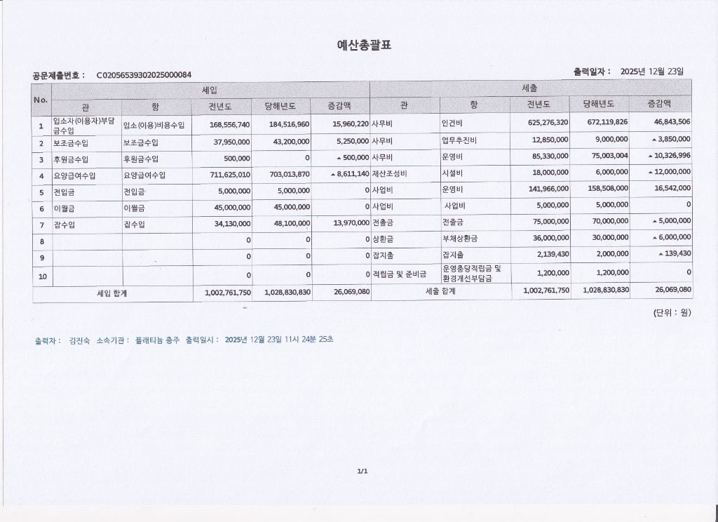 2026년 플래티늄 충주 예산서 공고 관리자 2025-12-23 14:50 사회복지법인 및 사회복지시설 재무.회계규칙 제2장 예산과 결산 제10조에 근거하여홈페이지 공지사항에 플래티늄 충주 2025년도 예산서를 공고합니다. ※입소 및 등급문의는 유선상 연락주시면 친절하게 안내도와드리겠습니다 ^^ 주소 : 충북 충주시 교동13길 13-29 연락처 : 043 - 910 - 2000 이전글 2025년 송년잔치 안내 목록