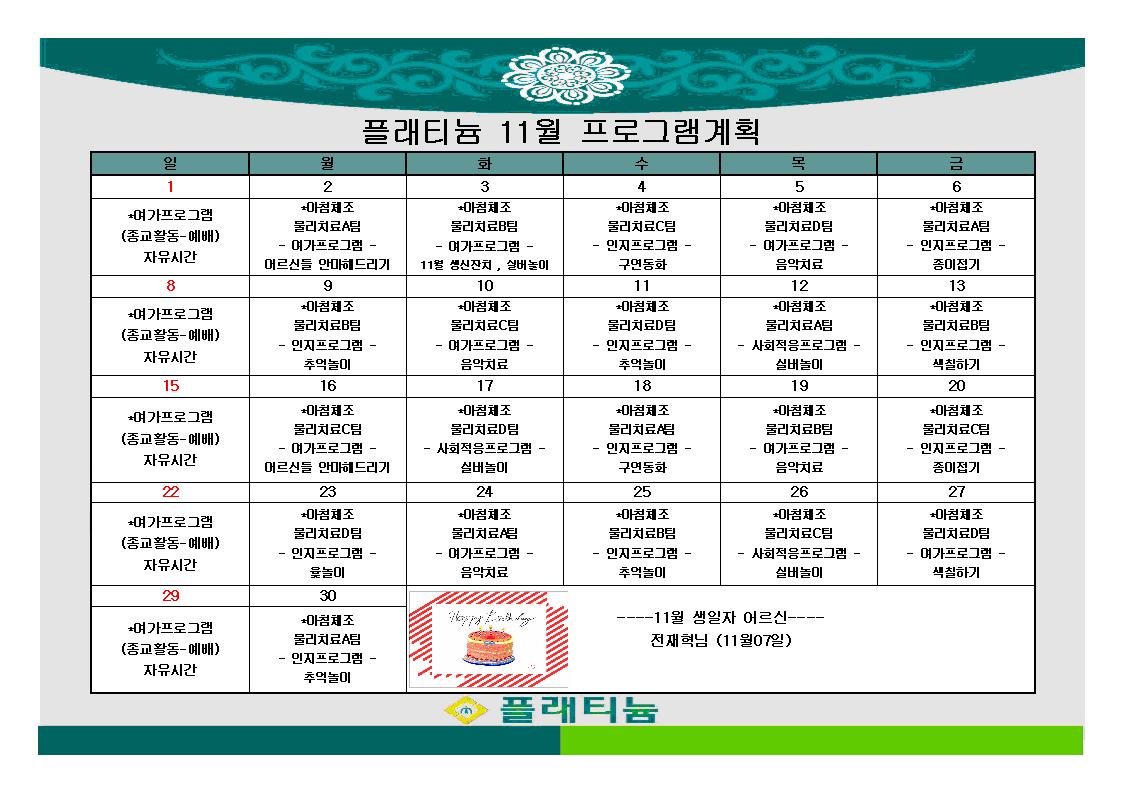 2020년 11월 프로그램 관리자 2020-10-27 10:23 ※입소 및 등급문의는 유선상 연락주시면 친절하게 안내도와드리겠습니다 ^^ 주소 : 충북 충주시 교동13길 13-29 연락처 : 043 - 910 - 2000 FAX : 043 - 910 - 2002 다음글 2020년 12월 프로그램 이전글 2020년 10월 프로그램 목록
