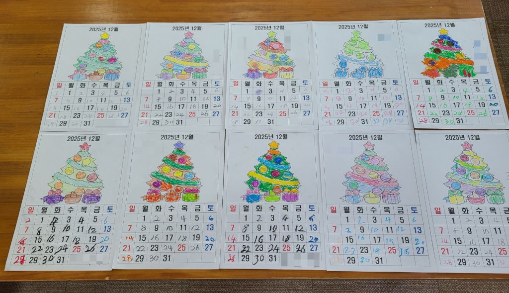 달력만들기 관리자 2025-12-03 16:06 12월 달력만들기를 하였습니다크리스마스 추리를 색칠하시고 숫자를 써 넣어멋진 12월 달력을 완성하셨습니다~ ○입소문의는 유선상 연락주시면 친절하게 안내 도와드리겠습니다^^ ○주소: 충북 충주시 교동 13길 13-29 ○연락처: 043)910-2000 다음글 접시 난타 이전글 성게볼 놀이 목록