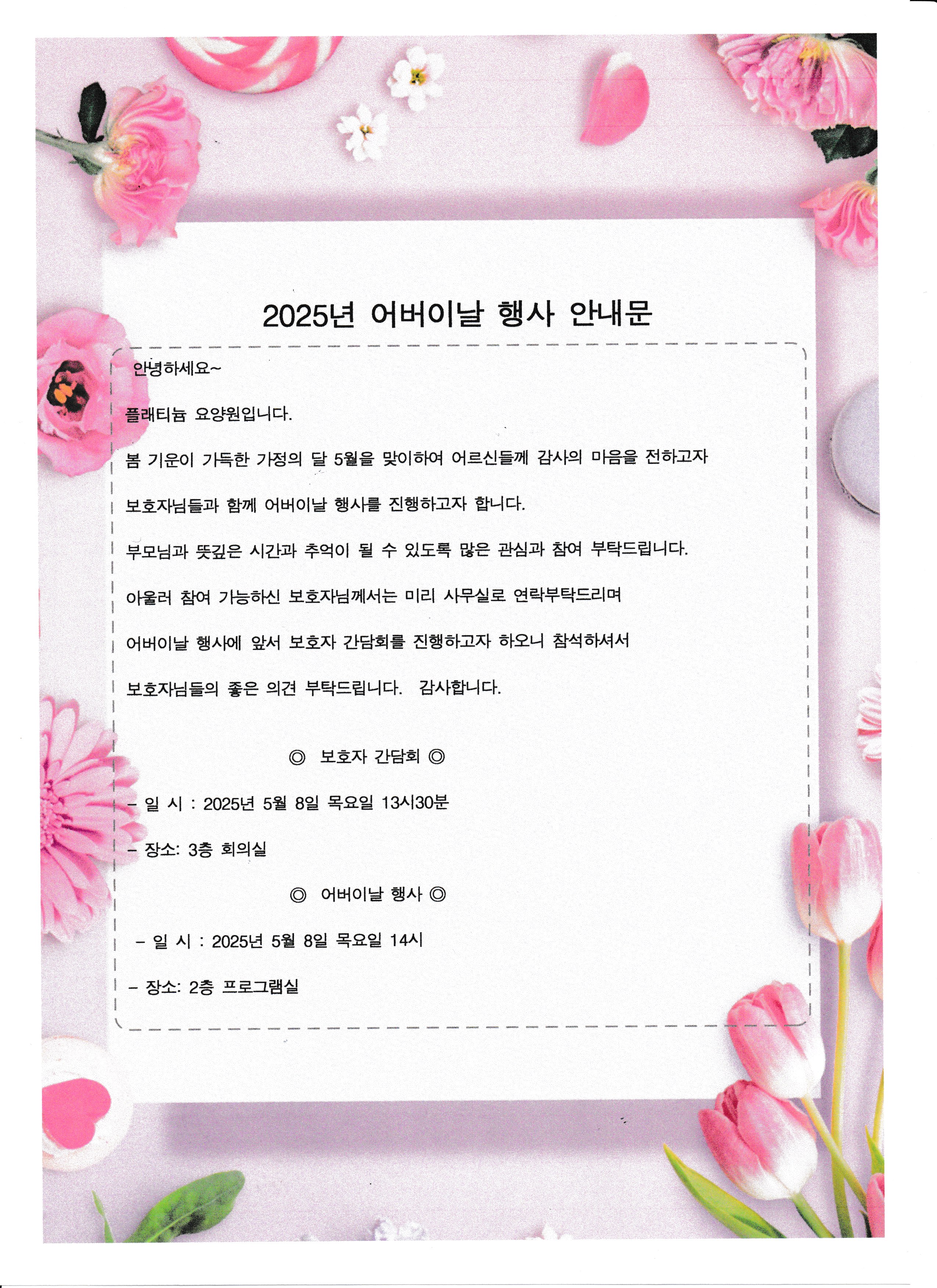 2025년 어버이날 행사 안내 관리자 2025-05-07 13:15 어르신들의 편안함을 위하여 최선을 다해 노력하겠습니다 ※입소 및 등급 문의는 유선상 연락주시면 친절하게 안내도와드리겠습니다 ^^ 주소 : 충북 충주시 교동13길 13-29연락처 : 043 - 910 - 2000 다음글 2025년 6월 프로그램 일정 이전글 2025년 5월 프로그램 일정 목록