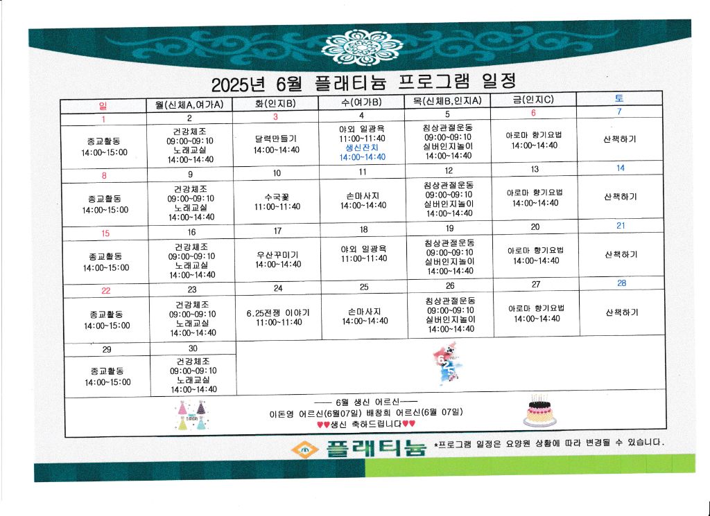 2025년 6월 프로그램 일정 관리자 2025-05-29 10:55 어르신들의 편안함을 위하여 최선을다해 노력하겠습니다. ※입소 및 등급문의는 유선상 연락주시면 친절하게 안내도와드리겠습니다 ^^ 주소 : 충북 충주시 교동13길 13-29연락처 : 043 - 910 - 2000 다음글 2025년 7월 프로그램 일정 이전글 2025년 어버이날 행사 안내 목록