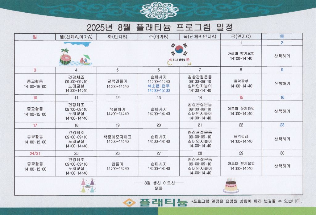 2025년 8월 프로그램 일정 관리자 2025-07-30 15:19 어르신들의 편안함을 위하여 최선을다해 노력하겠습니다. ※입소 및 등급문의는 유선상 연락주시면 친절하게 안내도와드리겠습니다 ^^ 주소 : 충북 충주시 교동13길 13-29연락처 : 043 - 910 - 2000 다음글 2025년 송년잔치 안내 이전글 2025년 7월 프로그램 일정 목록